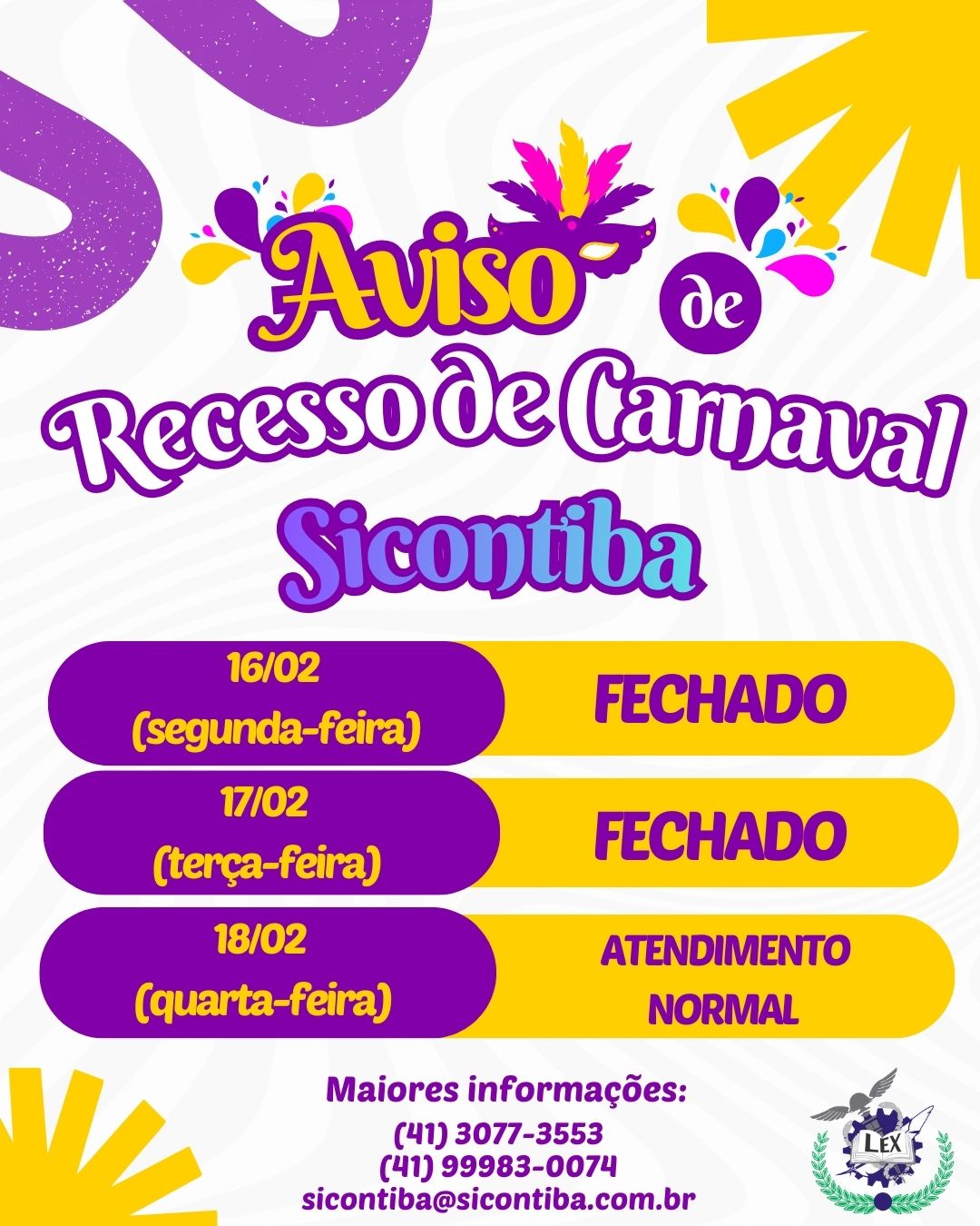 Comunicado – Recesso de Carnaval 2026 Publicado em 13/02/2026 Compartilhe: Valorizando o Passado – Inovando no Presente – Fortalecendo o Futuro Compartilhe: Relacionados Participação do Sicontiba em articulação institucional garante avanços sobre alertas fiscais da EFD Nova proposta da Copel para o ACT 2025-2027 será apreciada e votada pelos copelianos – Acesse o Edital – Minuta de Proposta – Link para o Voto Sicontiba fortalece parceria com a CRESOL, que terá posto de atendimento a partir de fevereiro de 2026 Deixe um comentário Clique aqui para cancelar a resposta. Nome * E-mail* Site Enviar comentário