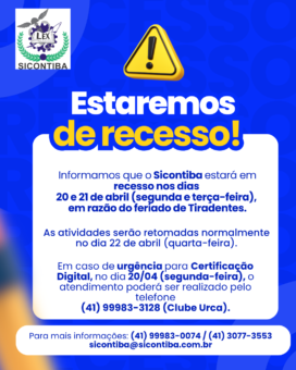 Comunicado – Recesso de Feriado Tiradentes 2026 Publicado em 17/04/2026 Compartilhe: Valorizando o Passado – Inovando no Presente – Fortalecendo o Futuro Compartilhe: Relacionados Sicontiba participa da campanha “Declare Certo” e leva orientação gratuita à população Copa Cresol – Narciso Doro promete movimentar o fim de abril com grandes disputas Sicontiba conquista acordo coletivo histórico com a Sanepar para 2026/2028 Deixe um comentário Clique aqui para cancelar a resposta. Nome * E-mail* Site Enviar comentário
