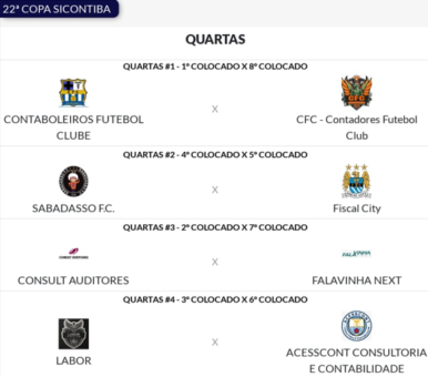 De acordo com o regulamento, os 1º e 2º colocados da fase de grupos – Contaboleiros e Consult Auditores – jogam as quartas de final com a vantagem do empate para garantir vaga nas semifinais.