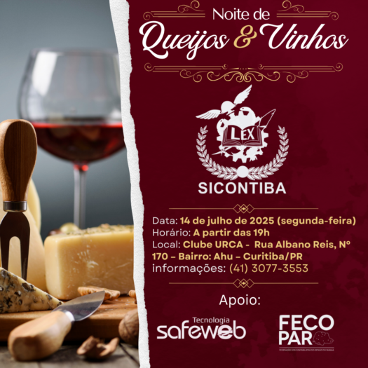 Na noite de 14 de julho de 2025, o Sicontiba promoveu, no tradicional Clube URCA, um elegante e memorável evento de Queijos e Vinhos. A celebração marcou a união e o fortalecimento da parceria entre o Sicontiba, a Fecopar e a empresa SafeWeb, reunindo uma seleta audiência composta por representantes de entidades contábeis, contabilistas, empresários, patrocinadores, parceiros e agentes políticos do Estado do Paraná.