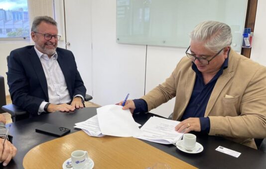 Na foto, o Diretor-Presidente da Sanepar, Wilson Bley Lipski, e o presidente do Sicontiba, Dirceu Vaz, durante a assinatura do Acordo Coletivo de Trabalho (ACT) 2026/2028.